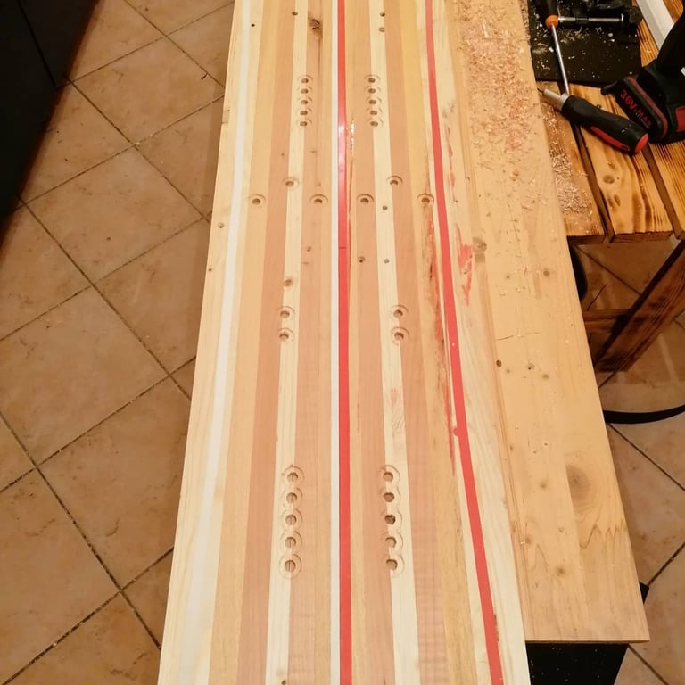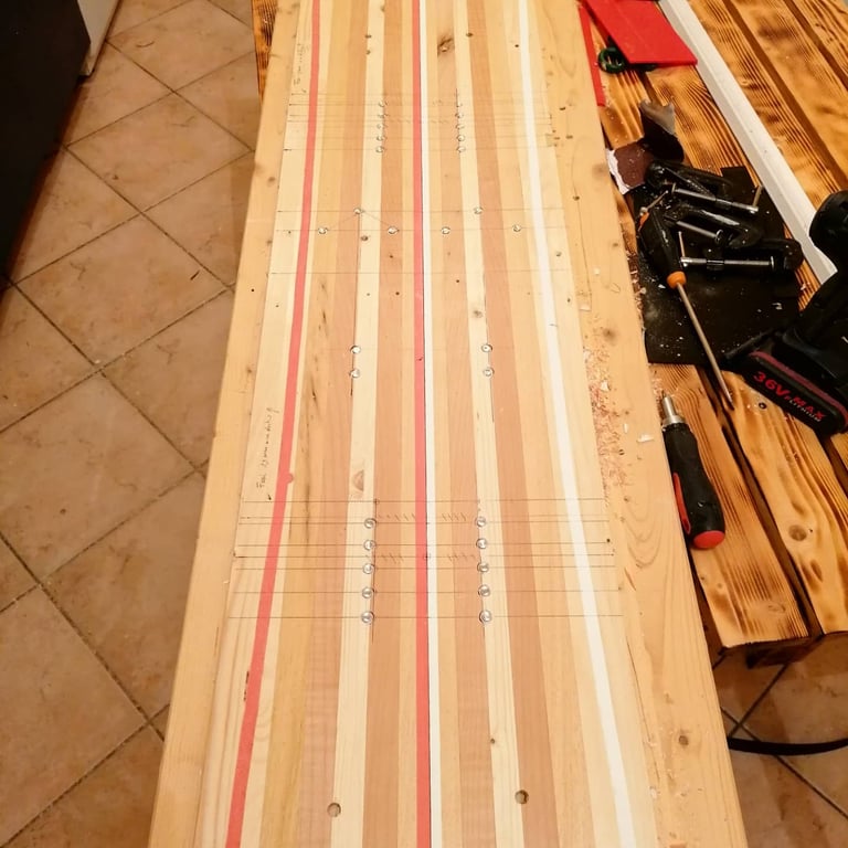 Dopo avere incollato i vari listelli di legno tra loro, ho ottenuto una tavola di circa 40cm che ho successivamente provveduto a piallare per ottenere una superficie completamente piana, nonchè il primo vero core del mio snowboard.